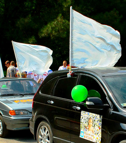 Через минуту еще не развернутый белый флаг в руках президента нашего фонда И.И.Никишиной будет развиваться над автомобилем.