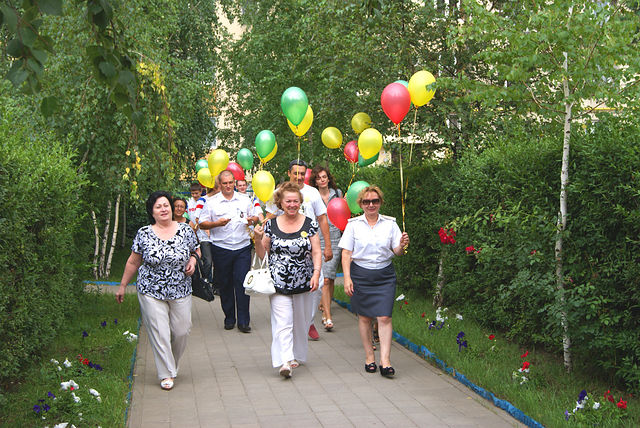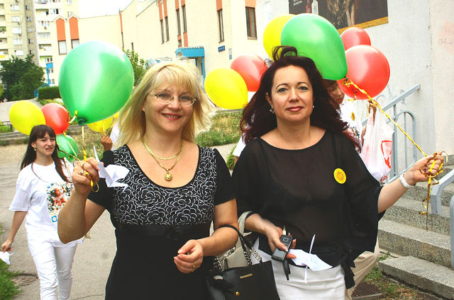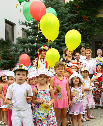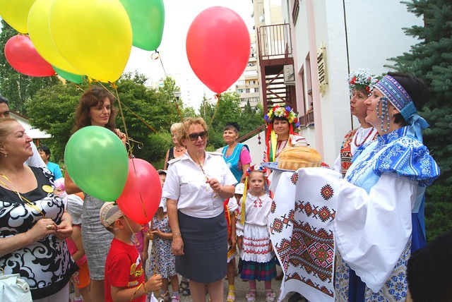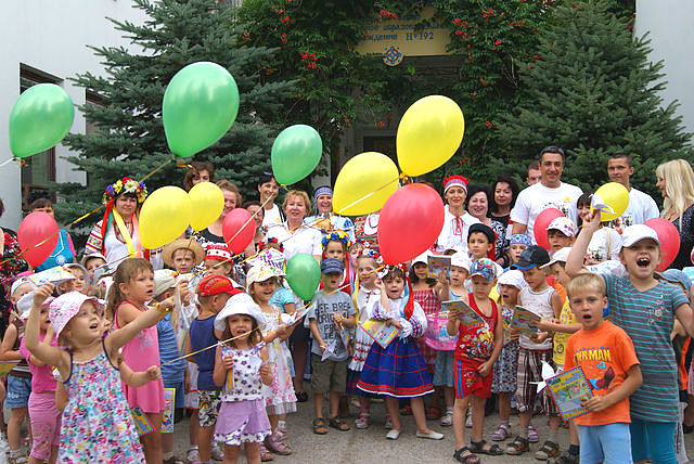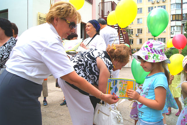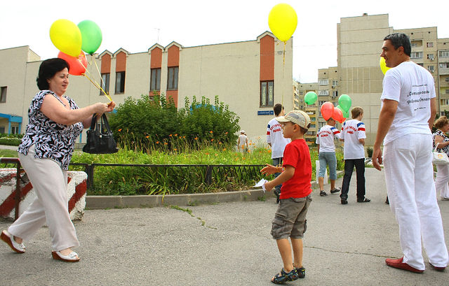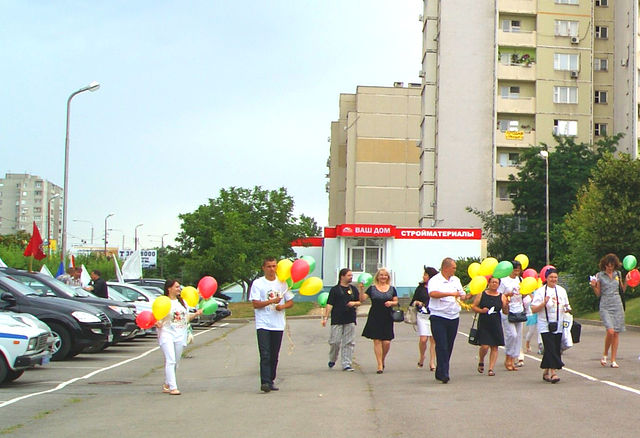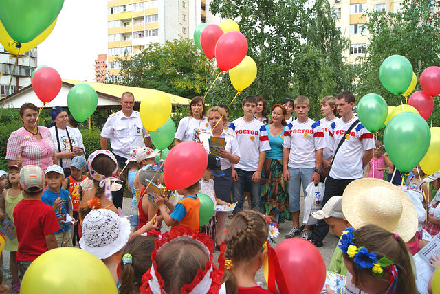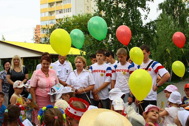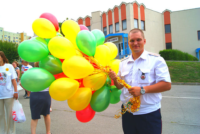 От Дома офицеров все участники автопробега дружной «пешей колонной» с разноцветными воздушными шарами в руках проследовали в детский сад «Веселинка».