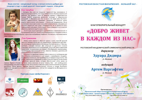 24 декабря 2011 года состоялся Большой благотворительный концерт «Добро живёт в каждом из нас». Соорганизатор -редакция журнала «Ростовчанка» http://rostovchanka-media.ru/
