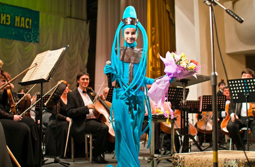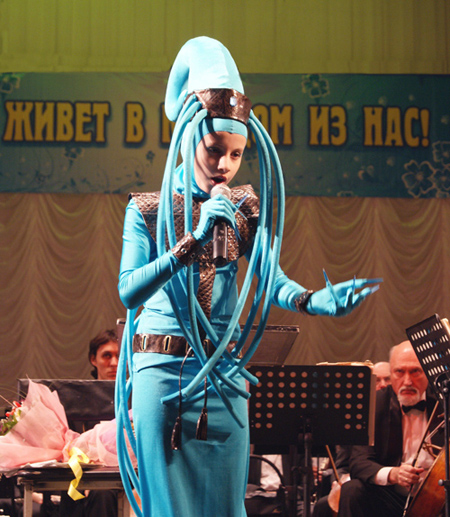 Благодарственную паузу Лариса Яковенко завершила так: «Уважаемые друзья, благодаря всем Вам, наша добрая воля может приумножиться до размеров Вселенской. Для Вас – предновогодний подарок, который дарит Вика Оганнисян в образе инопланетянки, как символ Вселенского Добра».