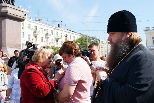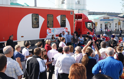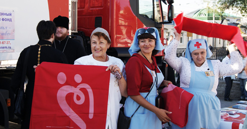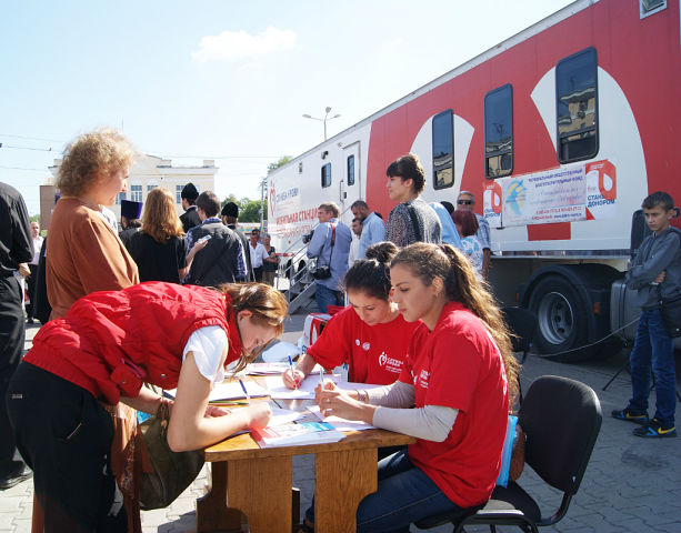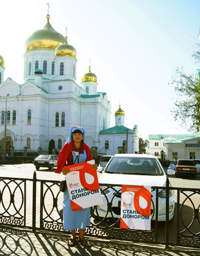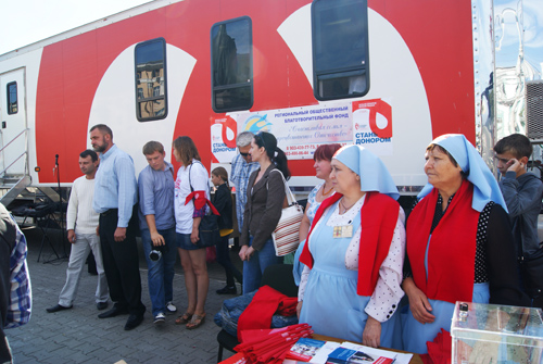 Это добротворческое событие проходило на Соборной площади г. Ростова-на-Дону (автор данного фотоснимка-Дмитрий Мельников). Акция была инициирована Министерством здравоохранения Ростовской области и организована совместно с Ростовской-на-Дону епархией в рамках реализации Государственной программы развития добровольного донорства «Служба крови».