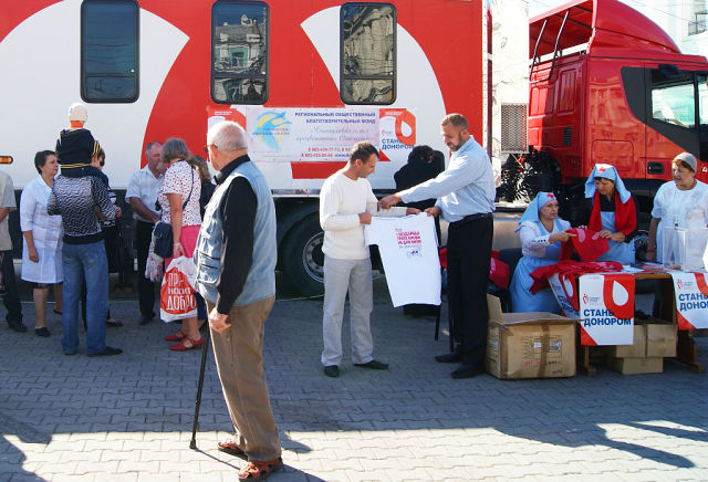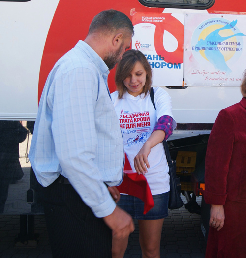 Всем донорам, сдававшим кровь в этот день не первый раз, и ростовчанам, пришедшим на акцию впервые, было уделено должное внимание: каждый получил в подарок от фонда футболку, шарф и бандан с логотипом «Служба крови».