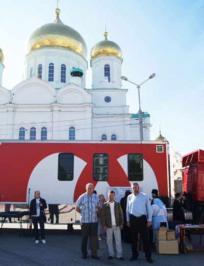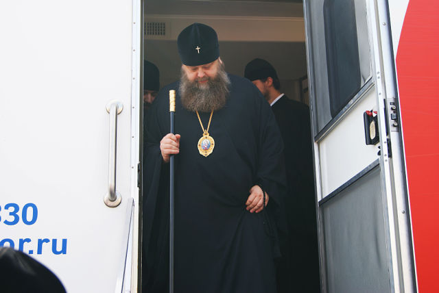 На фото: Митрополит Ростовский и Новочеркасский Меркурий выходит из трейлера после сдачи крови.