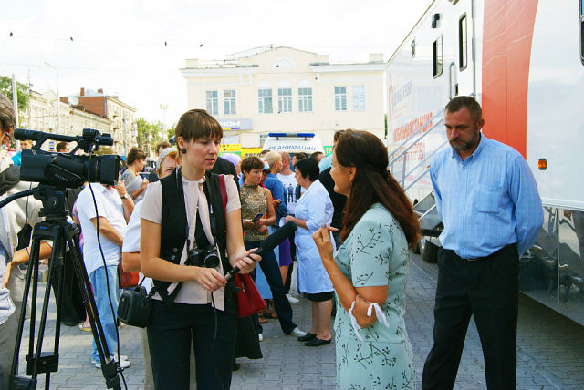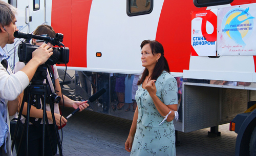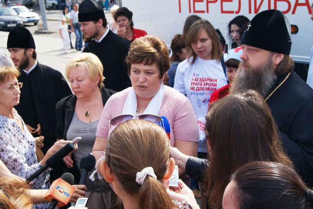 На фото: И.Никишина отвечает на вопросы представителей СМИ о донорском направлении в работе фонда. На вопрос журналиста "Страшно сдавать кровь?" она ответила: «Убивать страшно! Спасать людей - радостно!».