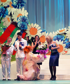 Председатель комиссии Парламентского Собрания по социальной политике, науке, культуре и гуманитарным вопросам Виктор Водолацкий вручил призы (ноутбуки) от Парламентского Собрания Союза Беларуси и России лучшему исполнителю от Республики Беларусь Андрею Григорьеву из г. Минска и лучшему исполнителю от Российской Федерации Ирине Тюленевой из г. Москвы.
